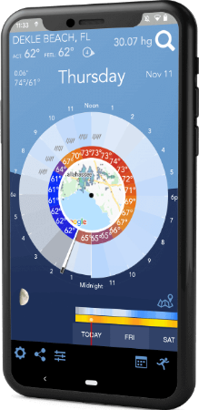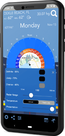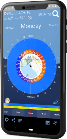 Users can view 24-hour weather forecasts on an animated radar that enables easier weather interpretation and route planning. The radar also uses distinct coloration to pinpoint sky colors instead of conventional icons.